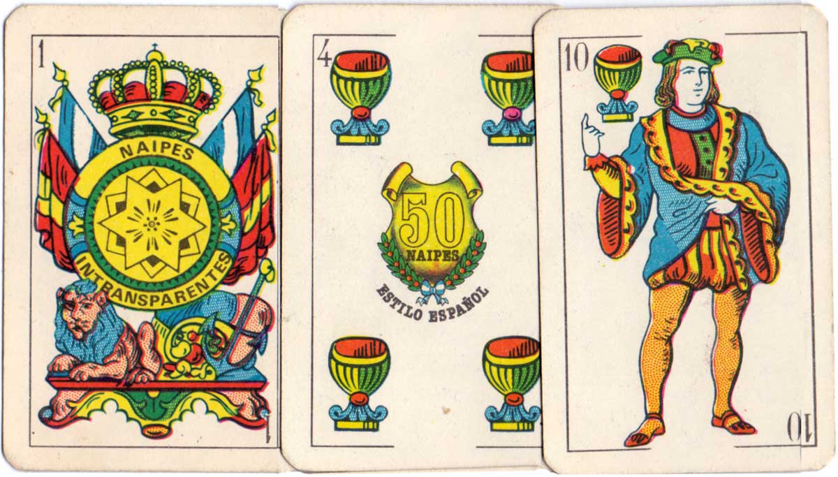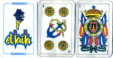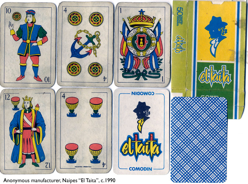 Cards from Naipes "El Taita", c.1990s, anonymous manufacturer (probably Naipes La Española / Gráfica 2001) based on the Spanish Cadiz pattern used by Vigor S.R.L.