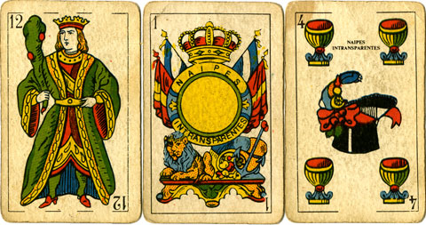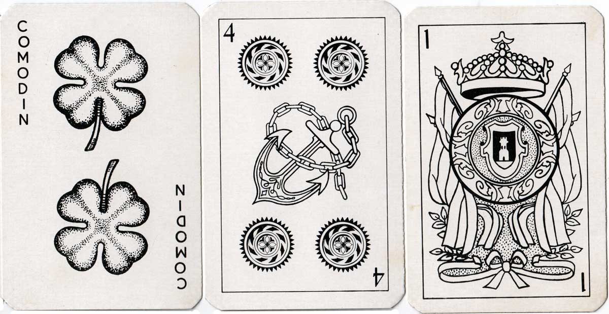Cards from another anonymous Catalan-type deck, titled "El Ruedo", c.1980. The designs are based on those of Guarro (Barcelona) but are more simplified than the above examples, and colours of the flags on the ace of coins are altered. 48 cards + 2 Jokers.
