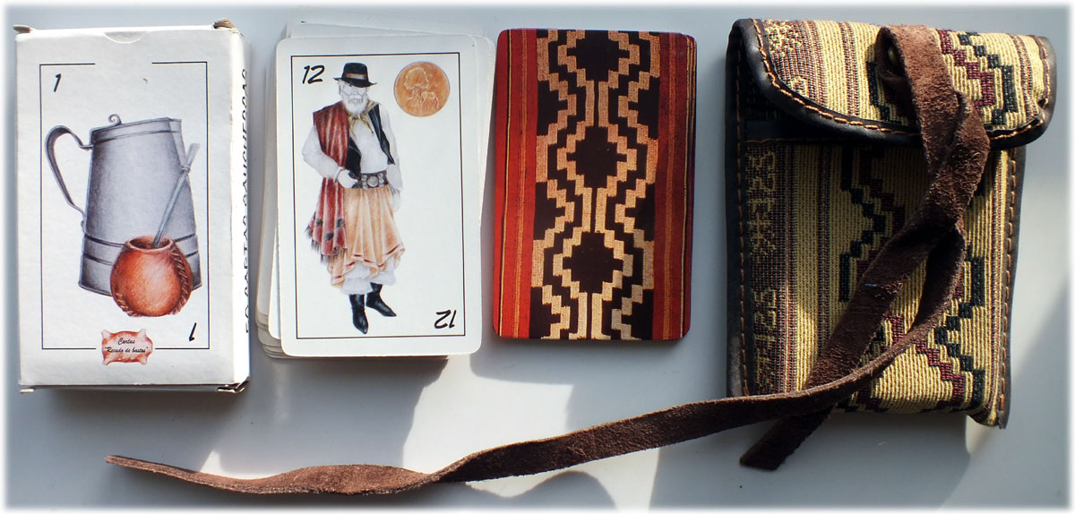 Above: Recado de Bastos (‘Gaucho Scrapbook’) Gaucho-themed deck from Argentina, anonymous manufacturer. 48 cards + 2 jokers in box in pouch with leather ties. The courts are repeated in each suit.