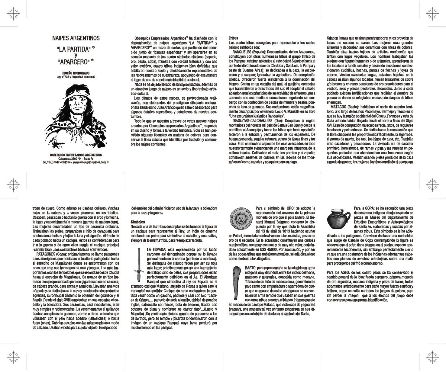 Above top: The Daiguita-Calchaquies tribe lived in the mountainous north-western area of Argentina, and were largely responsible for the fierce opposition offered to the Spaniards on their attempts to invade the territory. The ace of coins is represented by an image of the first gold coin made in Argentina, in 1813. The Ranqueles tribe (swords), descendants of the Araucanos, were the ethnic inhabitants of the pampas. They lived a hunter-gatherer lifestyle and resisted the white Europeans. They believed in a spirit of evil 'el galichu' and their beliefs were sometimes adopted by neighbouring tribes. Basket ware and weaving were their main crafts. The sword suit symbol is represented by a "facón caronero" a fighting weapon rather than a tool. The king depicts the legendary chief Mariano who liked to dress like a gaucho.
