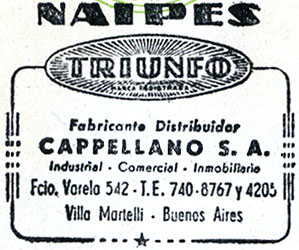 Above: 1950s magazine advert for Naipes Triunfo emphasising their 'washable' quality. The advert states that Naipes Triunfo were also available in black wrappers. The company address is given as: Orestes A. Cappellano de Jorge C. Oneto, Florencia Varela 542, Villa Martelli and the telephone number is: 740-8767.