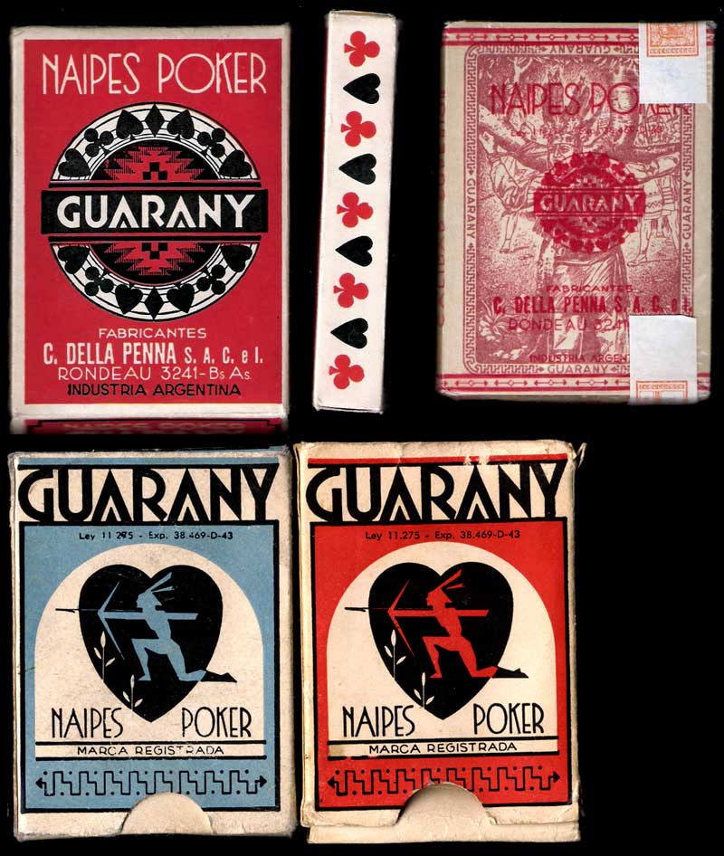 Above: two matching Naipes Guarany decks, with red or blue boxes and wrapper. The company name of C. Della Penna S.A.C.I, the orange 1 Peso tax band on the wrapper and the green "Marianne" tax stamp on the ace of hearts suggests a date of c.1955-68.