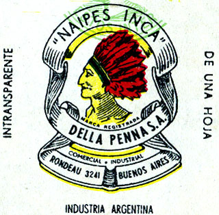c.1943-1965 (?) Left: logo from four of cups of most common version of Naipes Inca which appears to have been registered in 1943. This version spanned the period during which the tax stamp changed from a "Mercury" head to "Marianne", and so can be dated any time from c.1945-c.1965. The main detail to notice is that the company name C. Della Penna S.A. is in a serif typeface. All the other versions are in sans serif. Very small changes in detail can be observed between examples, showing that the plates were re-drawn on several occasions. For example, the typography of the words "Industria Argentina" can vary, noticeable in the letter "G" which can have a straight or curved ascending bowl. During this period, the logos on Naipes Porteño and the cards themselves were also re-drawn, and boxes were introduced instead of paper wrappers only, c.1960. |