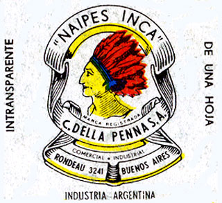 c.1970-1978 (?) Left: logo from four of cups from a later edition of Naipes Inca. The indian's headband is blue, and the initial letter "C" has been replaced before the company name, which now reads "C. Della Penna S.A." The lettering of the words "Industria Argentina" is higher than in the previous version, and the overall size of the cards is smaller. Advertising decks are common from this period. |