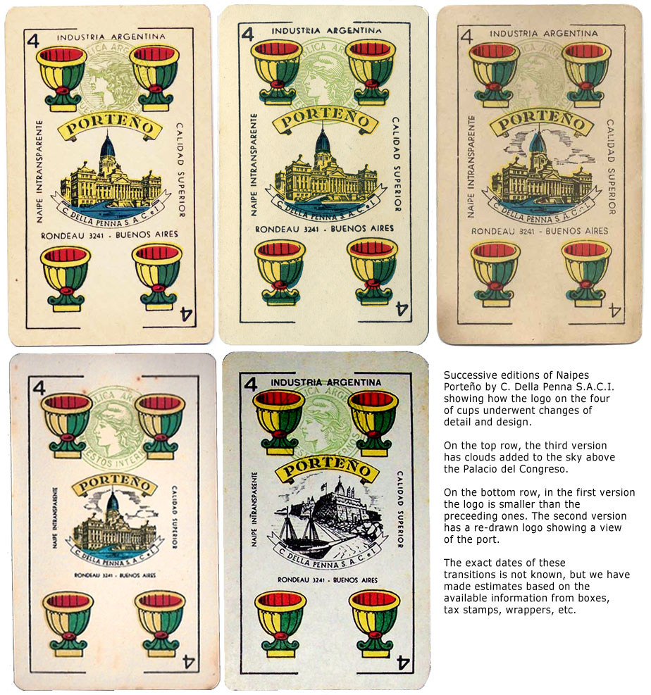 Naipes Porteño was one of Della Penna's leading brands of Spanish-suited playing cards, alongside Naipes Inca. It was produced in successive editions until the company was taken over in 1978. The brand name appears to have been registered in 1944, however it is not known whether it was already being published before this date. Over the years the logo on the four of cups changed. Earlier editions show the Palacio del Congreso, as seen on this page, but sometime during the 1960s it changed to a view of Buenos Aires port, perhaps to differentiate from "Naipes Congreso".