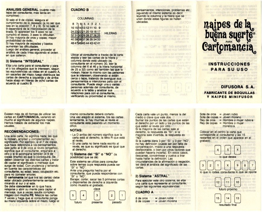 Instruction leaflet from Buena Suerte Cartomancy cards published by Difusora S.A., Argentina, c.1975