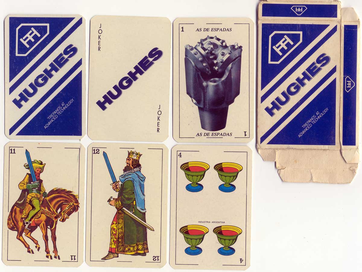 Above: Naipes Minifusor tipo Español made for Hughes, drill manufacturers, 1980s. The cards are the same as the above examples, but with special jokers and a non-standard ace of spades featuring a drill bit. See the Box►