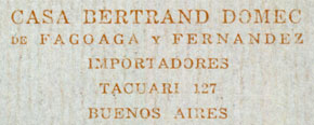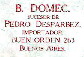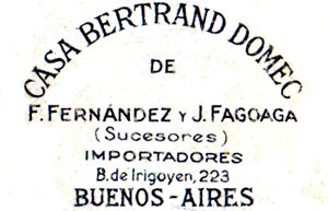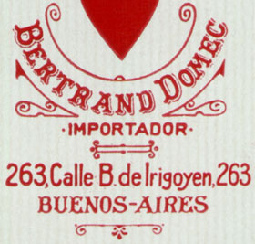 Bertrand Domec was an importer of playing cards into Argentina. The business was first established in around 1904 as successors to Pedro Desparbez, with the first address as Buen Orden 263, which was renamed later to Bernardo de Irigoyen 263, Bs. As. following a government decision to commemorate patriotic heroes in street names.