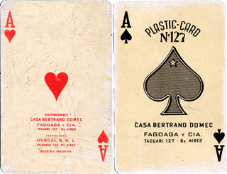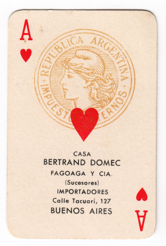 Above: Heraclio Fournier’s “Poker N°40” c.1960. The four of clubs carries the Spanish exportation tax stamp. The ace of hearts has the Argentinean importation tax stamp along with the importing agent's details: Casa Bertrand Domec de Fagoaga y Compañía (sucesores).