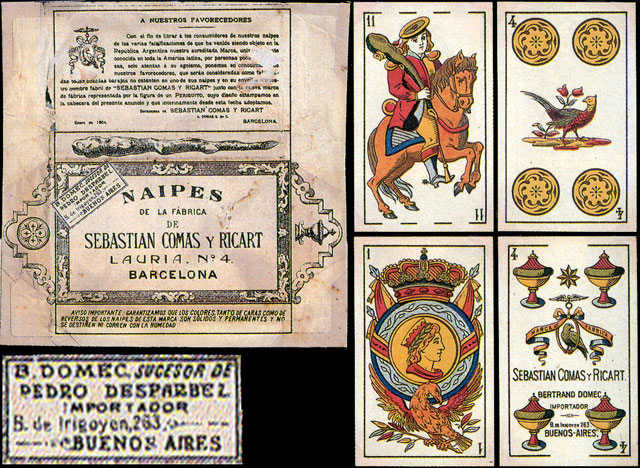 Above: four cards and wrapper from a pack imported from Spain. The date 1904 is printed on the wrapper, as well as mention that B Domec was successor to Pedro Desparbez, importer.