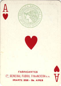 Above: Ace of Hearts with green "Impuestos Internos" tax stamp, and the address: Iriarte 2035, Bs Aires.
