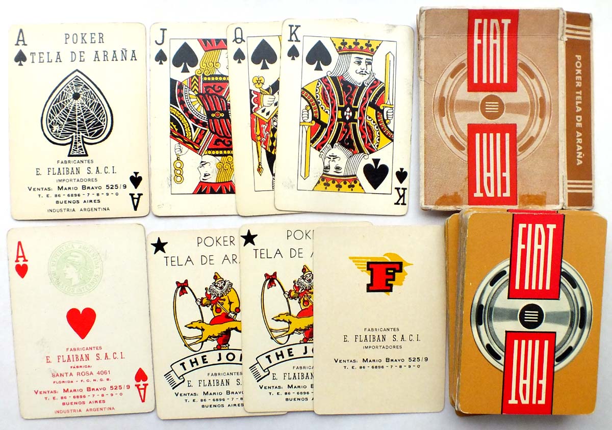Above: Poker Tela de Araña manufactured by Flaiban S.A.C.I. in c.1965 for Fiat automobiles. The address on the Ace of Spades and Joker has changed once again and is now at Mario Bravo 525/9 with new telephone lines. Marianne tax stamp on Ace of Hearts. Other advertising editions include Ford, Chrysler and Phillips.