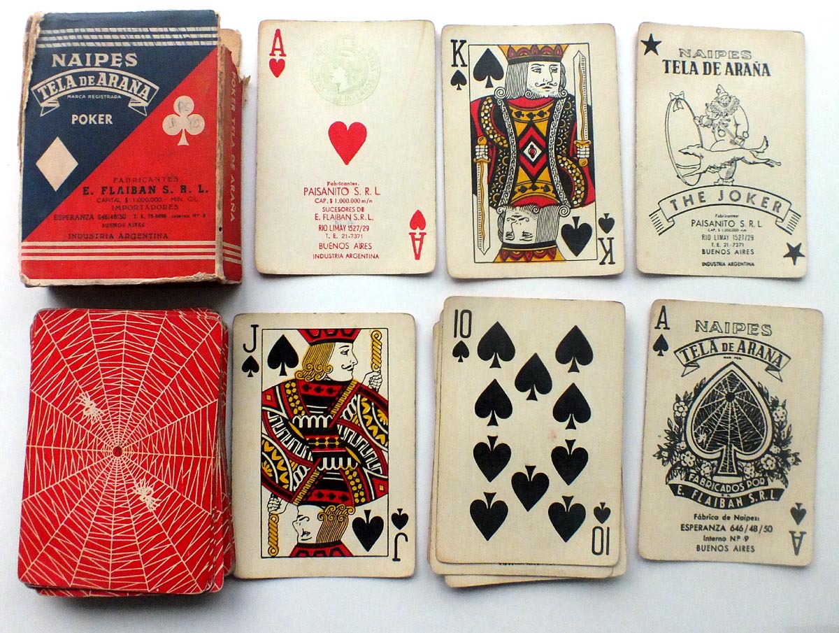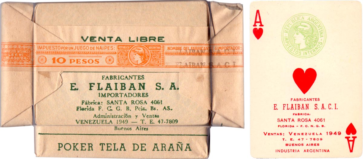 Above: Poker Tela de Araña manufactured by Flaiban S.A.C.I. in c.1960 featuring court cards based on American designs. The address on the Ace of Spades and Joker is Flaiban's sales address at Venezuela 1949 and on the Ace of Hearts the factory address is at Santa Rosa 4061. The Joker has the greyhound from the "Galgo" brand coloured. Marianne tax stamp on Ace of Hearts. See edition in tax wrapper→