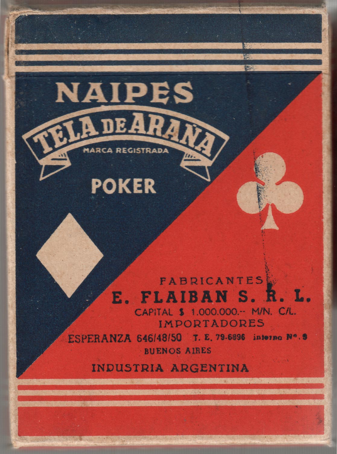Above: Poker Tela de Araña manufactured by Flaiban S.R.L. in c.1950. The address of the factory is Esperanza 646-50 and the administration and sales address is Corrientes 3679; later version of Mercury tax stamp on Ace of Hearts. For some reason the clubs courts are missing the yellow colour in this example. See earlier edition in tax wrapper→