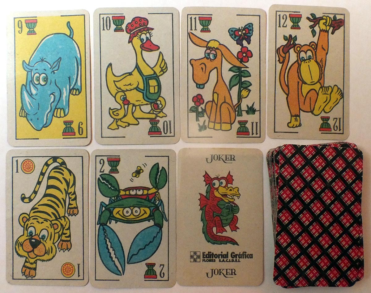 Above: 48-card Comic Animals playing cards, plus joker, c.1985. Every card has a different drawing. The Joker shows the name Editorial Gráfica Flores.