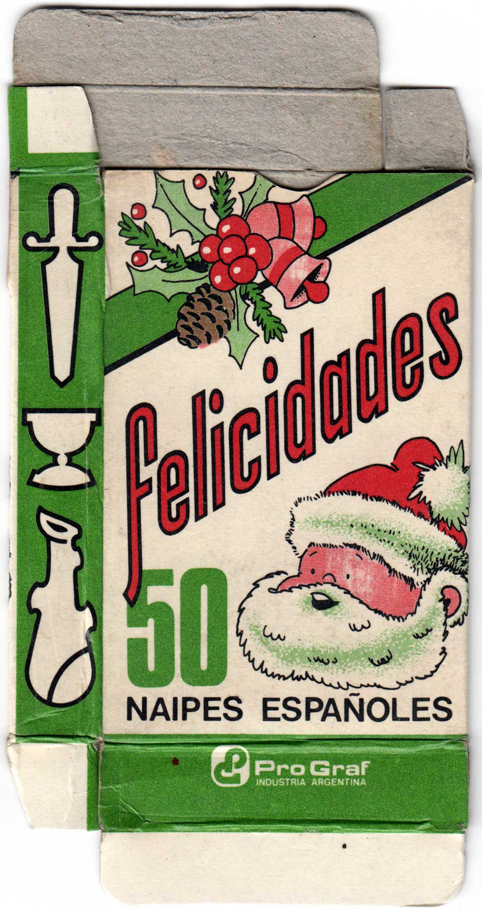 Above: “Felicidades” naipes Español, c.1973. 48 cards + 2 jokers. The same ace of coins and court designs are used as in the “Punto y Banca” decks shown above, including the roulette wheel jokers, but the four of coins features a different motif and the four of cups has extra decorations. The box states "Pro Graf Industria Argentina".