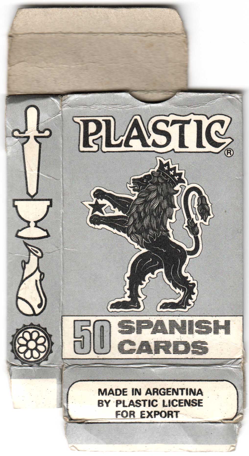 Above: “Plastic Spanish Cards”, c.1974. 48 cards + 2 jokers. The same ace of coins and court designs are used as in the “Punto y Banca” decks shown above but the four of coins features a different motif. The box states "Made in Argentina by Plastic License for Export" and "for professional use". The joker design is distinctive with a crowned lion holding a five-pointed star, which also appears on the box.