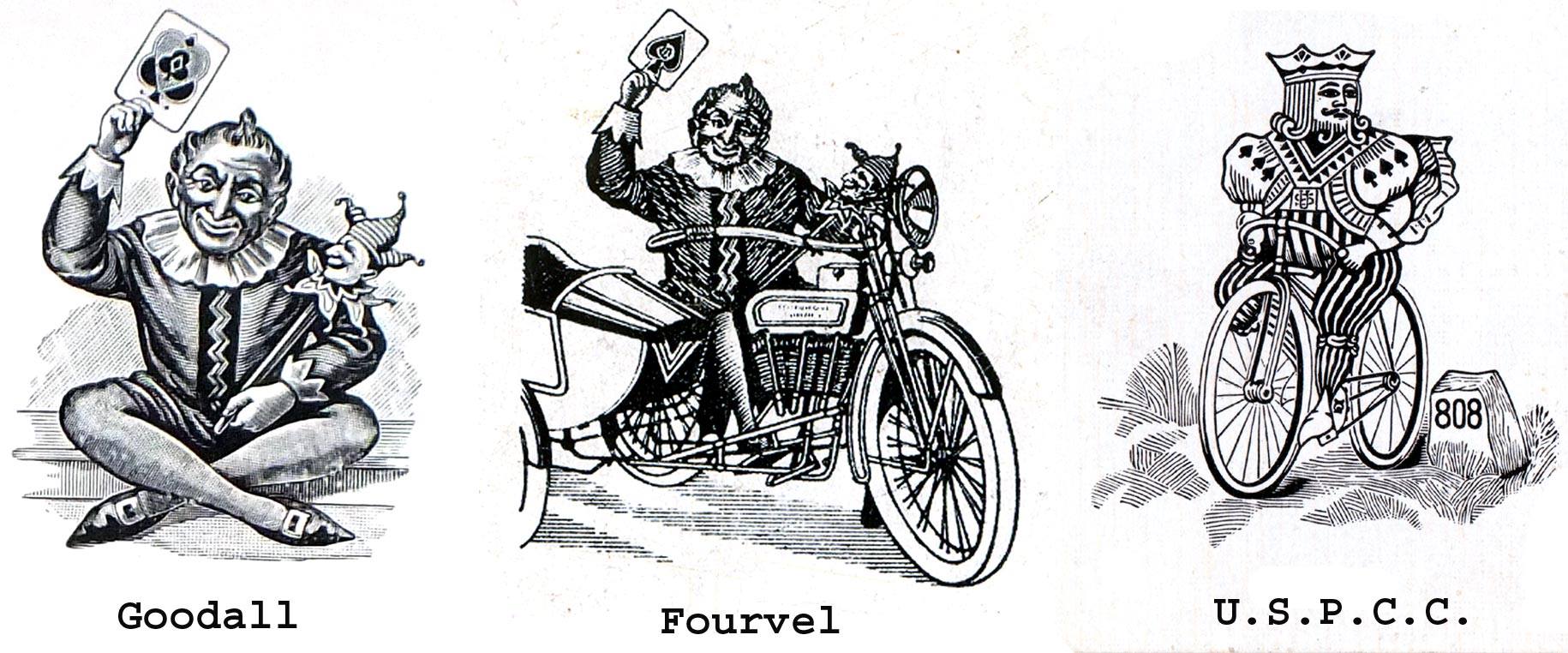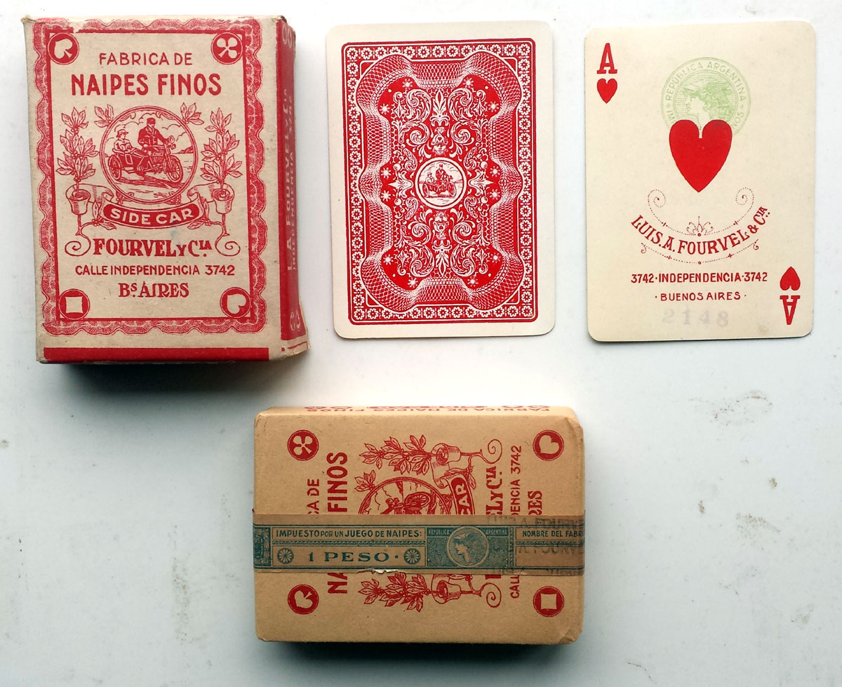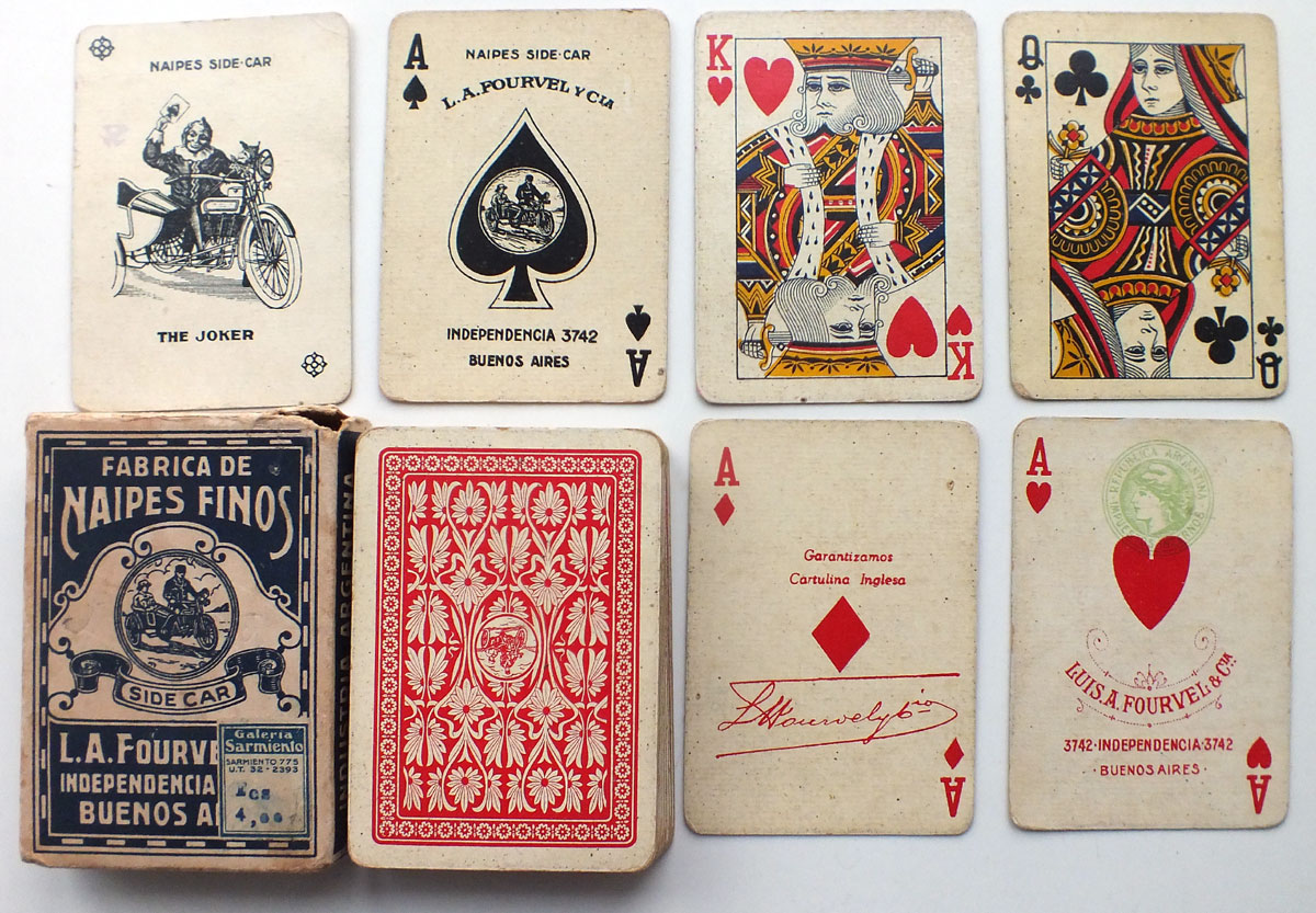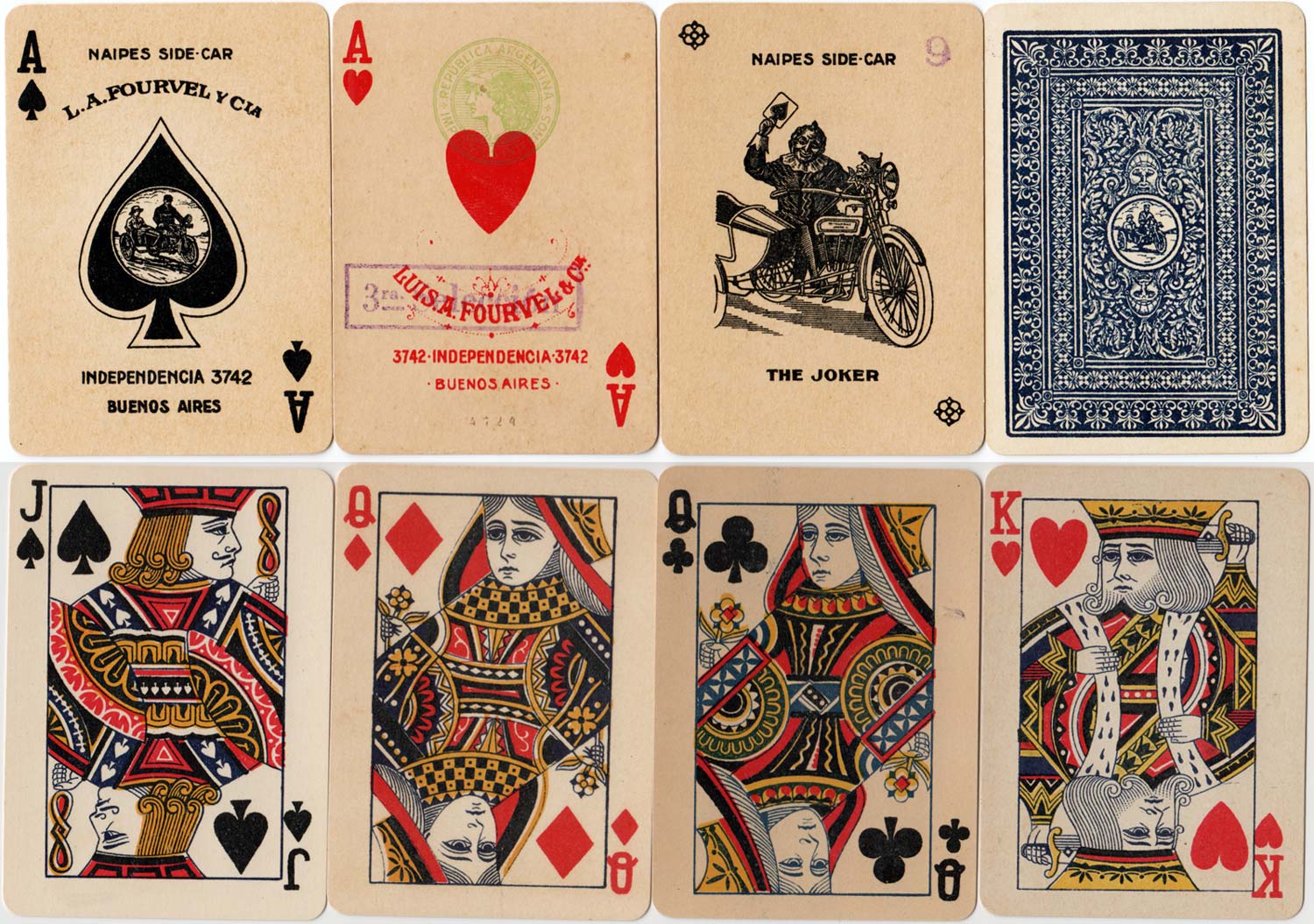 Luis A. Fourvel's standard English style Naipes Side Car were published over several decades, featuring a distinctive Joker based on Goodall's cross-legged Joker riding a motorcycle. The motorcycle & sidecar motif which appears on the boxes, wrappers, backs and Ace of Spades was also inspired by a Goodall back design from the 1920s, which in turn may have been inspired by USPCC's Bicycle brand. The same brand name was also used on Spanish-suited versions of Naipes Side Car and Belgian/Genoese versions.