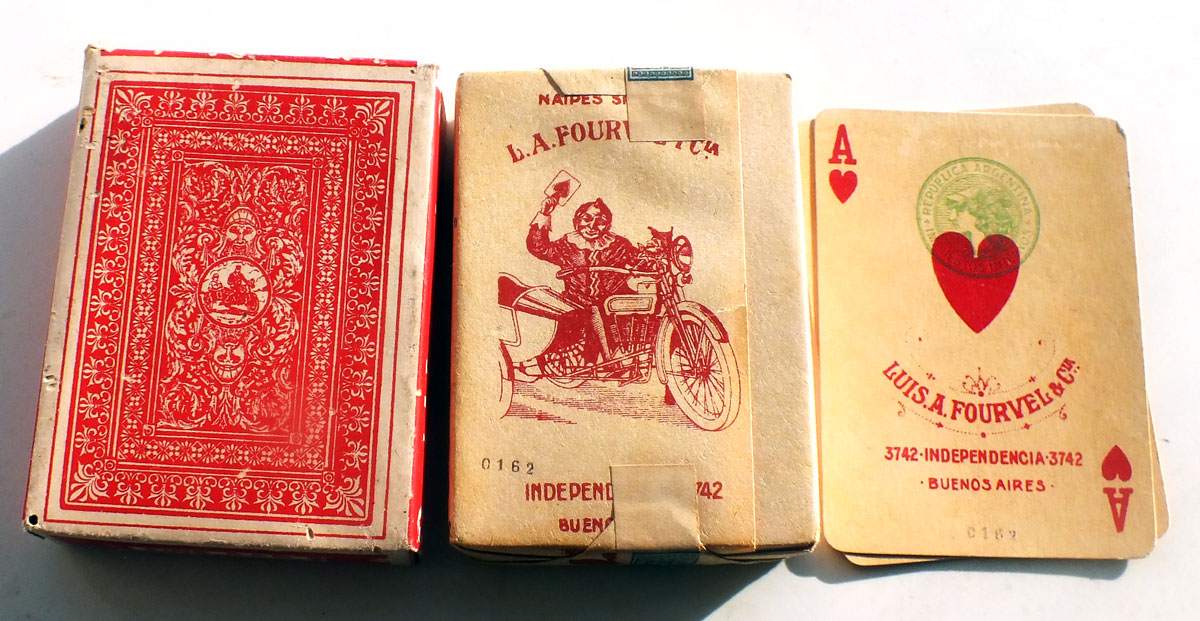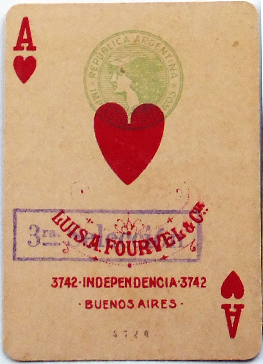 Above: cards from Naipes Side Car, manufactured by Luis A. Fourvel y Cía, Buenos Aires, c.1954. The Ace of Diamonds guarantees that the cards are made using English cardboard. The Ace of Hearts has the 'Liberty' tax stamp.
