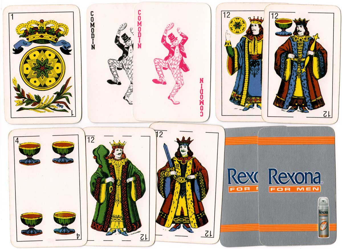 A similar deck is produced with the brand name Barcelonesa, the same as the above example except with a different logo on the Fours of Coins and Cups and Jokers, based on a brand originally published during the 1950s.