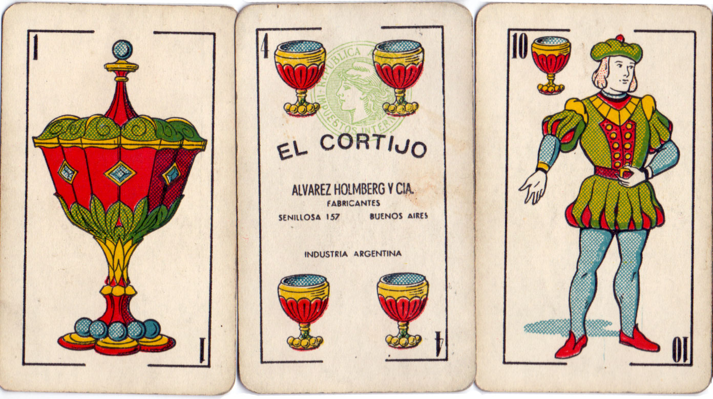 Above: Naipes ''El Cortijo' by Alvarez Holmberg y Cía, Buenos Aires, c.1950-70. The cards are slightly narrower than normal. The four of cups has the 'Marianne' tax stamp. (Clich image to zoom).