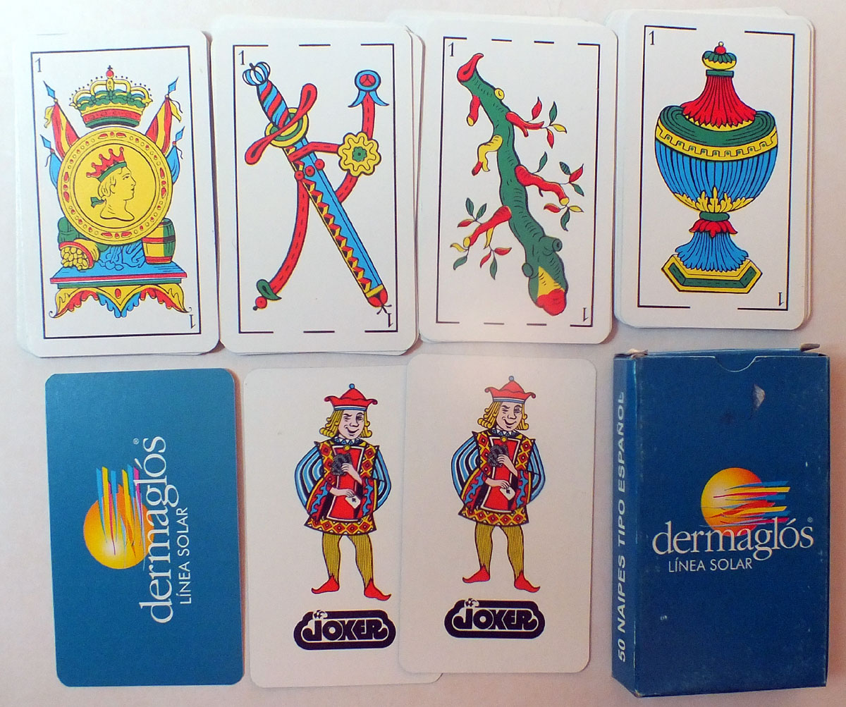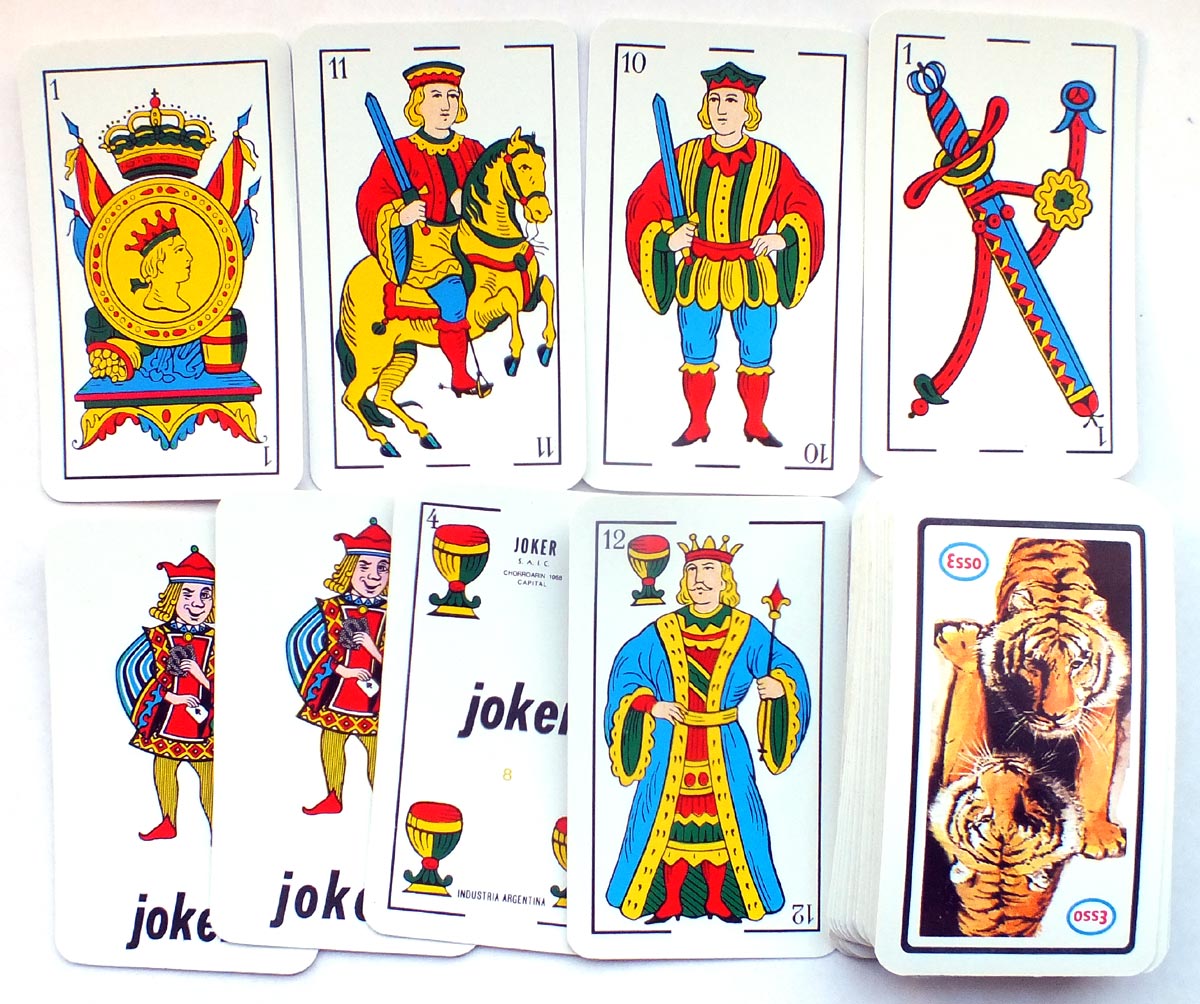 Joker S.A.I.C. produce a wide range including children's card games, tarot cards and advertising decks, some examples of which are shown on this page, alongside their standard Spanish-suited and Anglo-American playing cards.