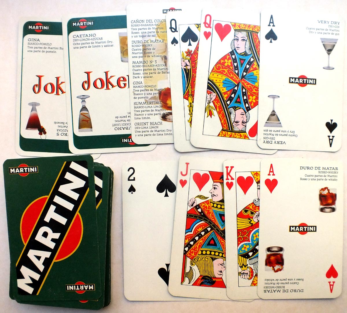 Above: standard English courts for Martini with cocktail recipes on the aces on a free publicity deck published by Meyer Action Marketing and manufactured by Joker, S.A., c.2006.