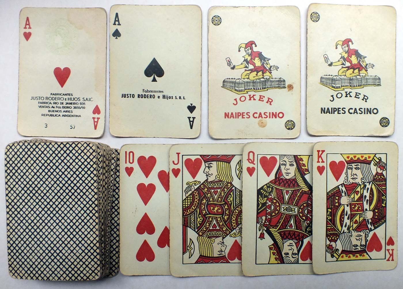 Above: Naipes Casino de Poker by Justo Rodero e Hijos S.A.I.C., c.1965. The factory address is given on the Ace of Hearts as Rio de Janeiro 935, with sales offices at Av. Fco Beiro 3855/59, Buenos Aires.