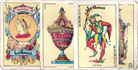 Above: cards based on Fournier's "Castilian" pattern with an original Joker and the legend 'La Banca' appearing in several places, c.1975-80