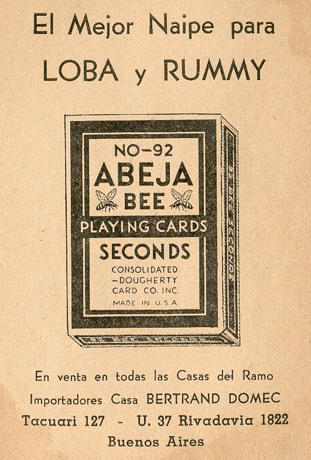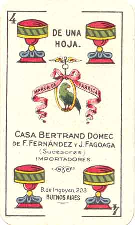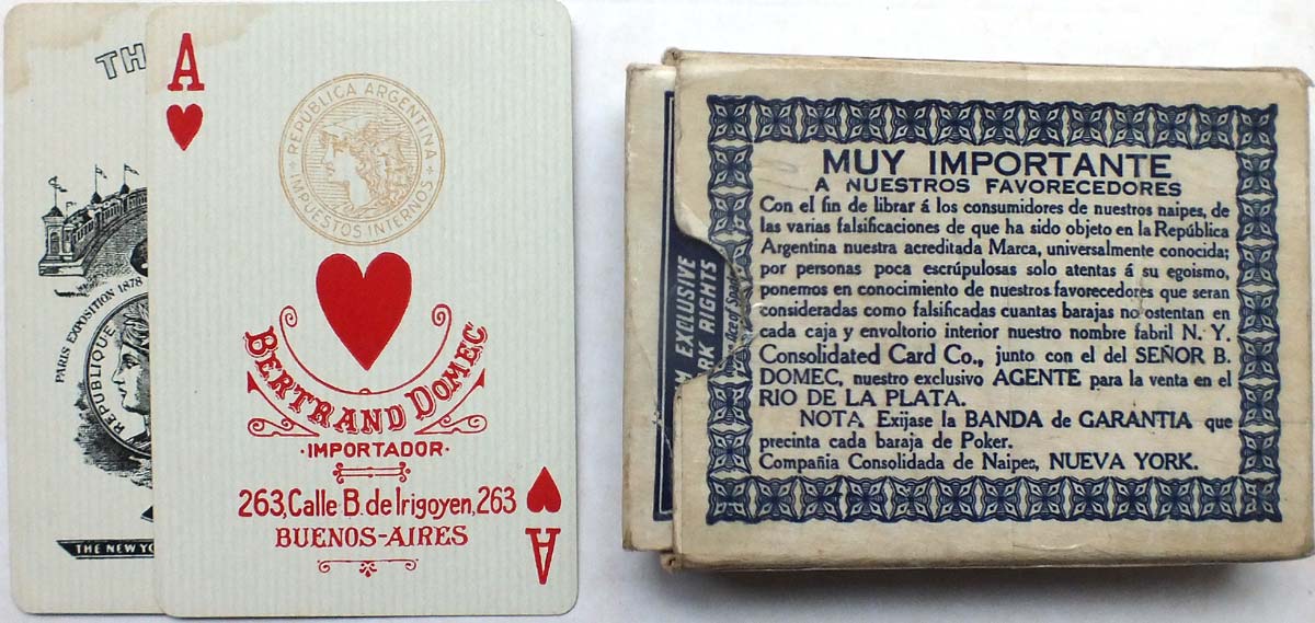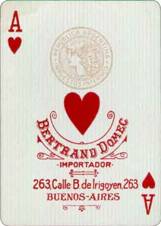 Above: The agent Bertrand Domec, whose fortunes can be followed through the changes of company name and address, was the exclusive agent of The New York Consolidated Card Company, U.S.A. Brands such as "Squeezers", "Bee-92" and "Congress" were used in Argentina. Records from the Cádiz chamber of commerce confirm that 15,420 packs of cards were exported from Cádiz to Argentina in 1908; 5,860 packs in 1910 and 2,720 packs in 1937. Greater quantities than this were exported to Mexico, the Canary Isles, Cuba, Chile and the Philippines [source: Pérez González, 1995]. |