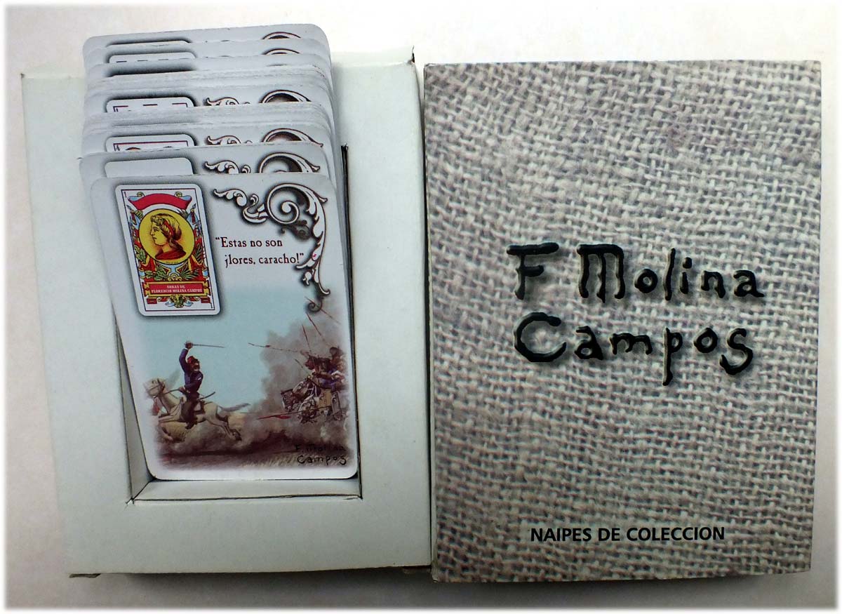 Naipes de Coleccion F. Molina Campos playing cards, published anonymously, Argentina, 2004 (not part of the ‘official’ range published by F. Molina Campos Ediciones, Buenos Aires). The designs feature miniature Castilian playing cards over Molina Campos paintings. See the Box►