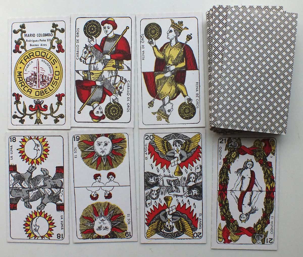 78-card 'Taroquis Marca Obelisco' published by Mario Colombo, Buenos Aires, during the 1950s, 60s & 70s, in the style known as "Tarocco Piemontese" which had been developed by Italian cardmakers during the nineteenth century.