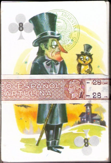 Above: ‘Yetatore’, a 40-card game with numerals 1-10 in each suit, 1968. ‘Yetatore’ means the bringer of bad luck and players seek to avoid this card. The 8 of clubs has the green ‘Marianne’ tax stamp and the brown 10 pesos tax band (below) corresponds to Ley 17,196 (1967-68).