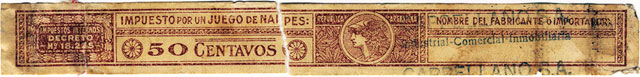 Above: a 50 centavos green tax band from a pack imported from Spain c.1930, referring to "Ley de Impuestos Internos No. 11,252" which was used between 1924-43. The box at the right-hand end contains the name of the importing agent: Casa Bertrand Domec de F. Fernández y J. Fagoaga.