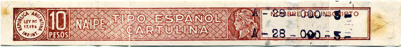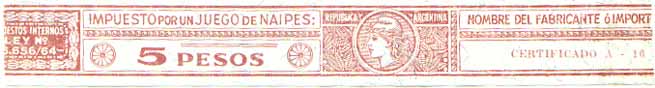 Above: tax band from a pack manufactured in Buenos Aires by Carlos della Penna, referring to "Ley No. 16,656/64" (1965-7). The amount of tax can be 5 or 10 pesos.