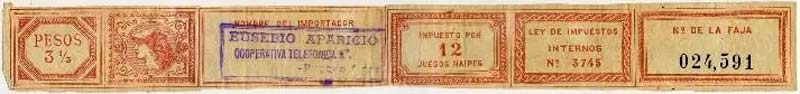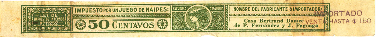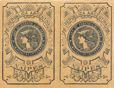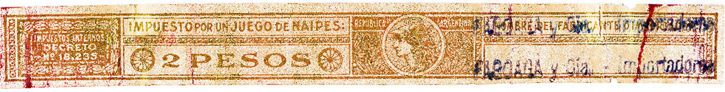 Duty was first introduced on playing cards in Argentina in 1892, as part of the Internal Duties law, and in 1896 the first duty labels were printed to be used on packets of 1 gross packs.