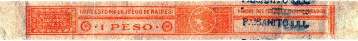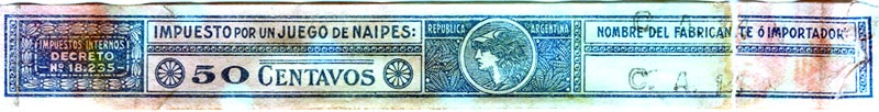 Above: 1 Peso blue tax band, normally used on imported decks, but occasionally used on home-manufactured ones, as in this case from a pack manufactured in Buenos Aires by Orestes A. Cappellano, c.1944, referring to "Decreto No. 18,235" which was used between 1944-64.