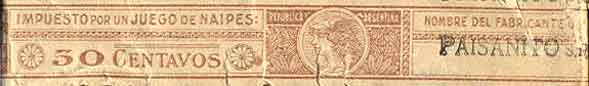 Left: green tax band (50 centavos) on outer wrapper of a standard pack made by Francisco Girbau, Buenos Aires, c.1925. "Ley de Impuestos Internos No.11252" of 1923. There was also a family of Girbaus manufacturing playing cards in Igualada (Spain) during the 1880s. The trade mark of a lion standing on two hemispheres beneath a radiant sun was used by several Spanish manufacturers of this time, referring to Spain and Hispano-American colonisation. (Image courtesy of Jose Luiz G Pagliari.)