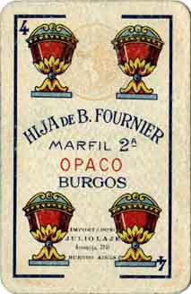 The 'Boletín Oficial' dated 26th January 1899 (Official Government Bulletin) states that the inland revenue tax bands on playing cards shall be black for home-produced packs, and red for imported packs. It appears that the colour of these tax bands varied in the course of time, as well as the colour of the tax stamps themselves (below). Furthermore, the bulletin also states that the manufacturer must print his name and address on each outer wrapper, and also submit the four of cups (in Spanish-suited packs) or the ace of hearts (in Anglo-American style decks) for a control stamp to be applied, and that this card, once stamped, must be left outside the wrapper for inspection. Similar regulations governed the supplies of cardboard which also were officially controlled. Offenders were fined.