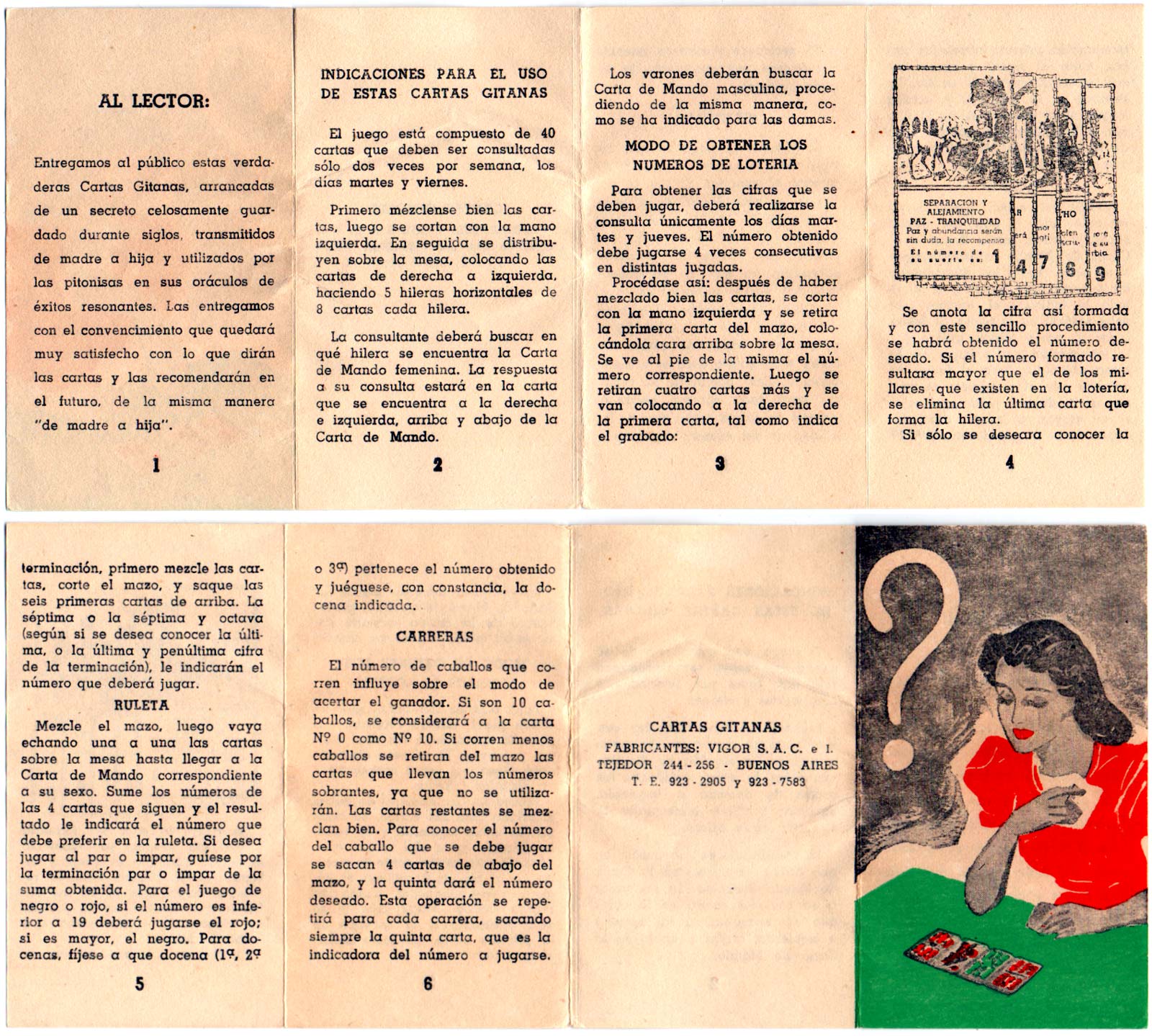 Published by Vigor S.R.L., Tejedor 244-256, Bs Aires in the 1950s (formerly by Igor Domicelj), and then successive editions into the 1960s. 40 cards + instruction leaflet in box. The Patent Office Registration documents, dated 22nd June 1955, show the original designs at the time of the take-over, with the new company name overwritten. The deck is presented as an ancient gypsy oracle, however, the designs are largely taken from nineteenth century Austrian "Rural Scenes" Tarock cards, which were not designed for fortune-telling.