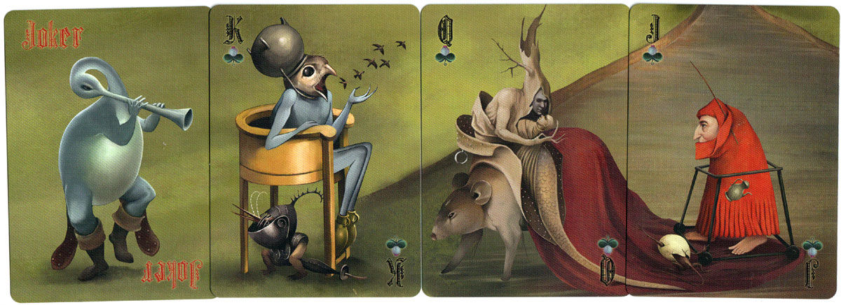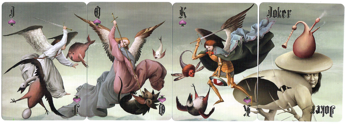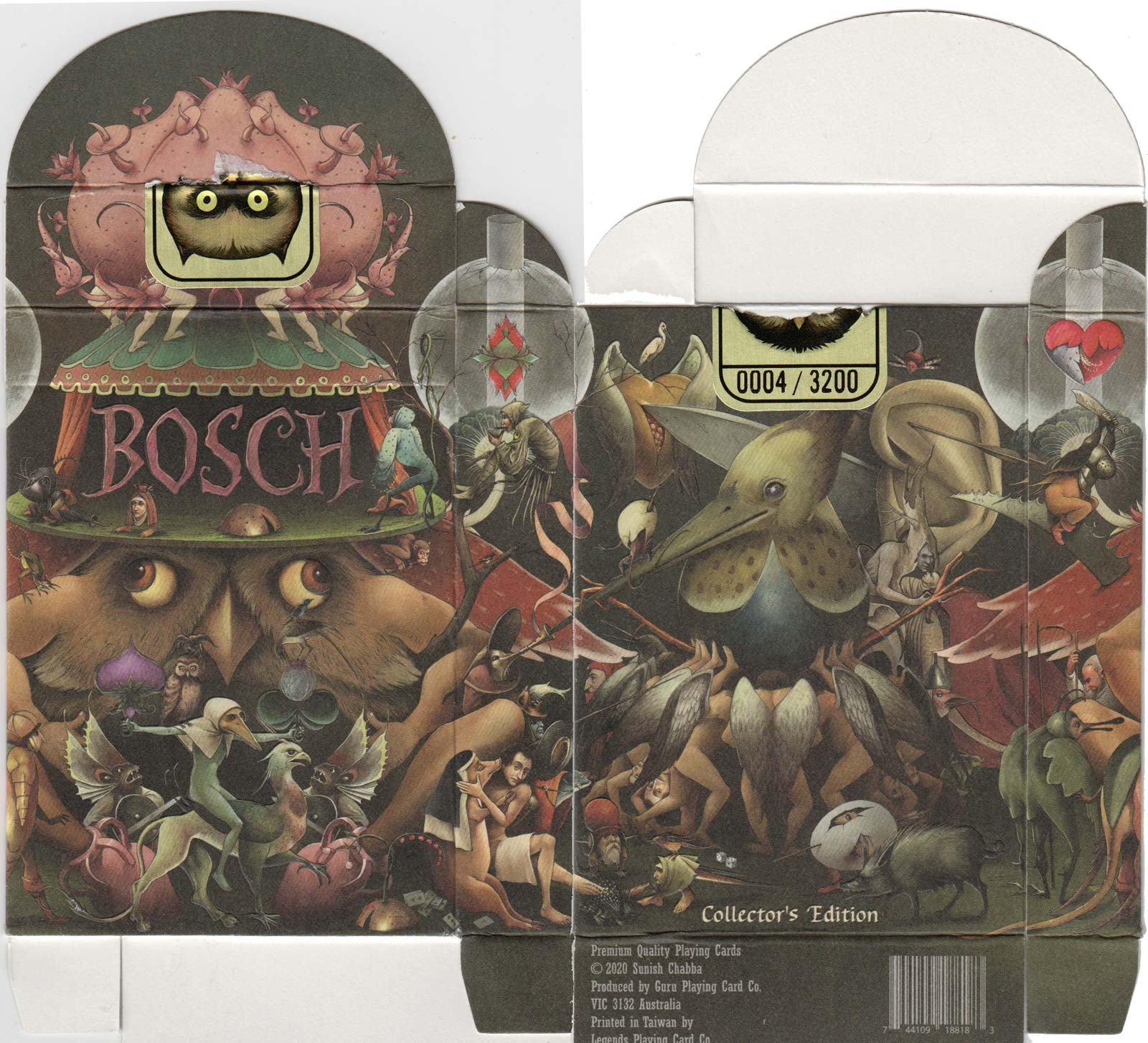 Above: selected cards showing scenes from Sunish Chabba’s Bosch Puzzle Transformed Playing Cards, Collector’s Edition, published by Guru Playing Card Co., Vic 3132, Australia, 2020. Printed in Taiwan by Legends Playing Card Co. 55 Poker sized cards (3.5" X 2.5") in tuck box. Miniature version also available.