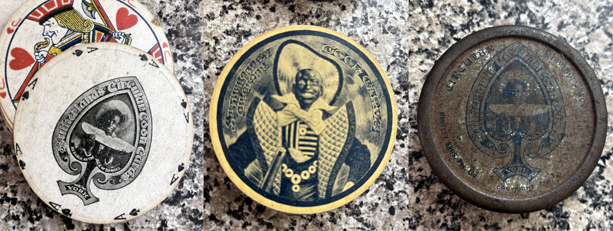 These antique playing cards come from a period when “coon songs” and minstrel imagery were mainstream entertainment. The circular cards and tin were unusual and a selling point as a clever example of late 19th-century packaging design. The very name “Coon Cards” was intended to be catchy, humorous, and marketable within a culture steeped in racial caricature.