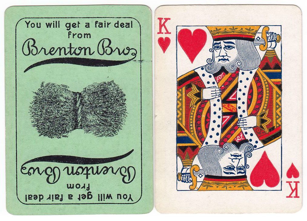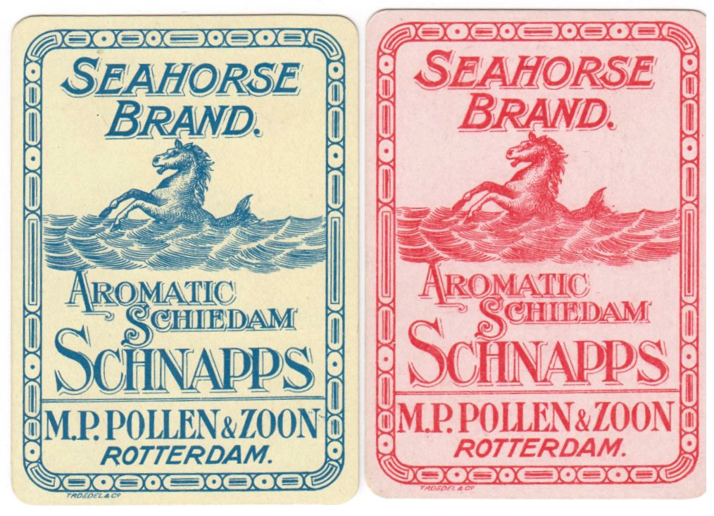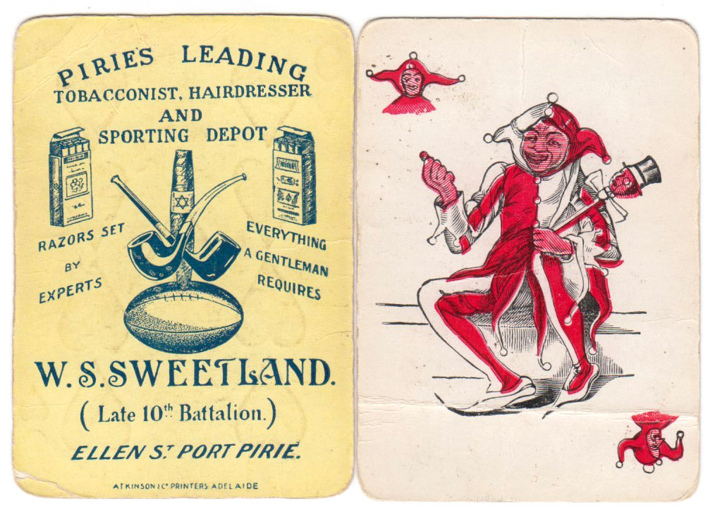 William Detmold kept boards with the faces printed ready for printing special designs or advertisements on the backs. Some of these would have been printed by other people such as Troedel & Co (Seahorse Schnapps), F.W. Niven & Co (Bartlett’s tea) and Atkinson & Co (Sweetland’s), as they’d have acquired the blank backed cards from Thomas/Detmold and then printed their own ads onto them. Two or four colour courts were used, depending on the budget.