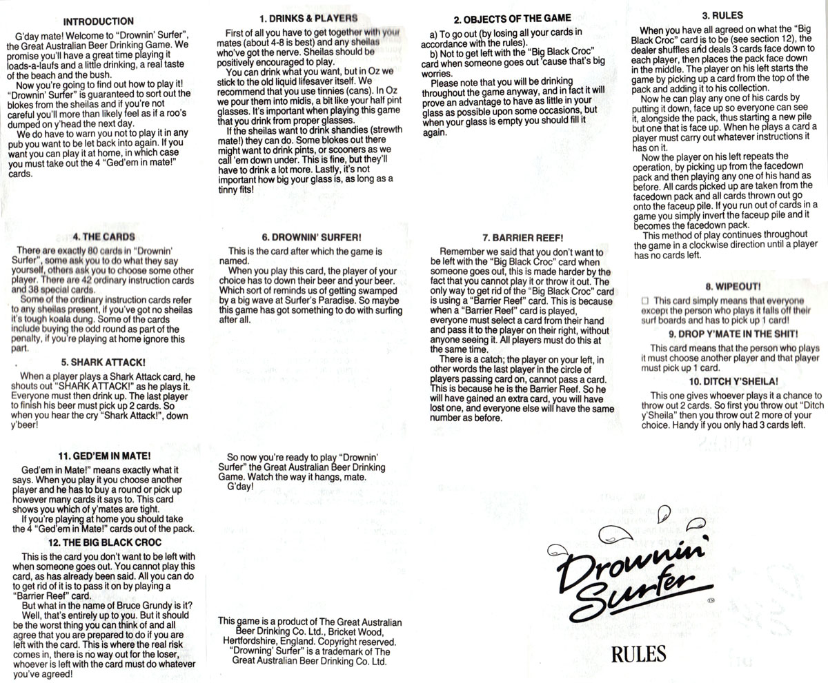 “Drownin’ Surfer” the great Australian beer drinking card game devised by Bill Hutton guaranteed to sort out the blokes from the sheilas... One of the objectives of the game is not to get left with the “Big Black Croc” card when someone goes out ’cause that’s big worries. The spirit of the game can be learnt by reading the rules→