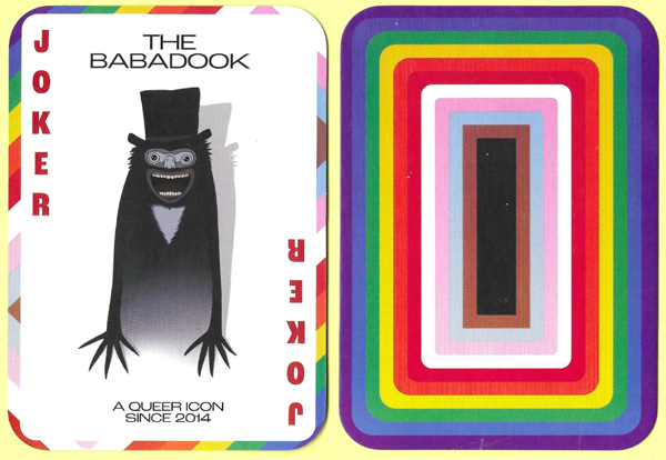 This pack was published in 2022 by Smith Street Gifts, an independent publishing company based in Melbourne, Australia. From the website this pack is “a celebration of LGBTQ+ activists, artists, comedians, writers, musicians and pop cultural giants who have shaped our worlds, expanded our horizons and radically increased queer visibility. This deck is a standard poker set, with the four classic suits and 52 of the world’s greatest queer icons”. The two jokers feature the Babadook – “a queer icon since 2014” (for an explanation see here►). The cards were designed by Phil Constantinesco, a freelance illustrator and motion designer based in Brussels, Belgium.