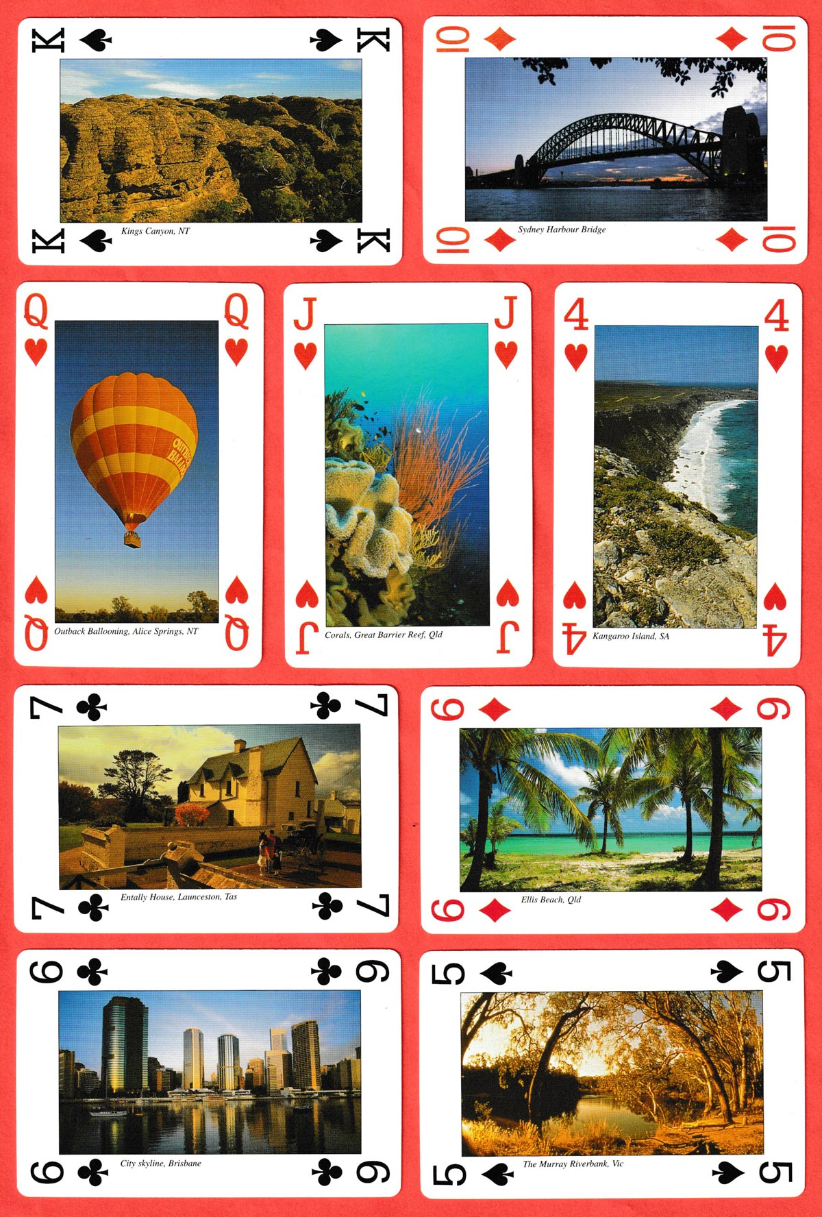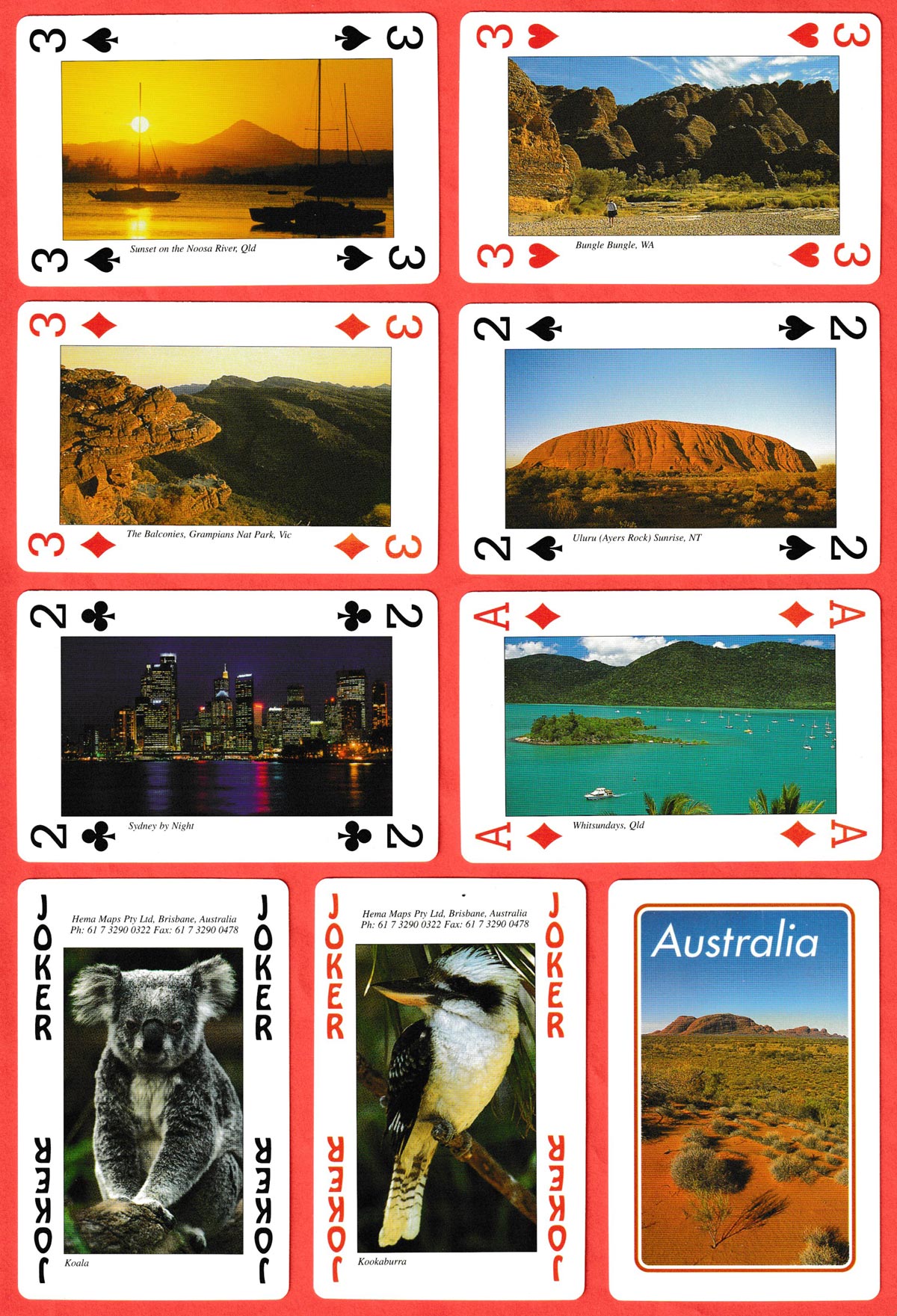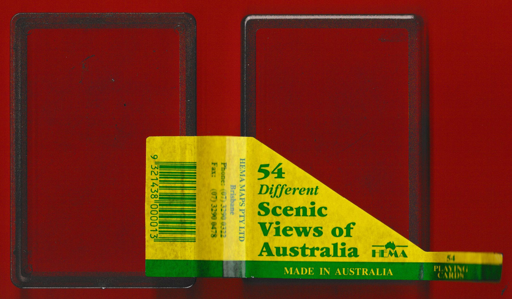 Above: Scenic Views of Australia playing cards published by Hema Maps Pty Ltd, Brisbane, Australia, c2002. 52 cards + 2 Jokers in plastic box. Size: 57.5 x 89 mm. Made in Australia.