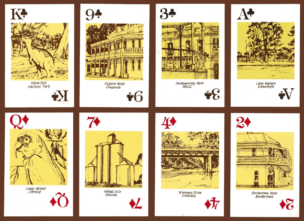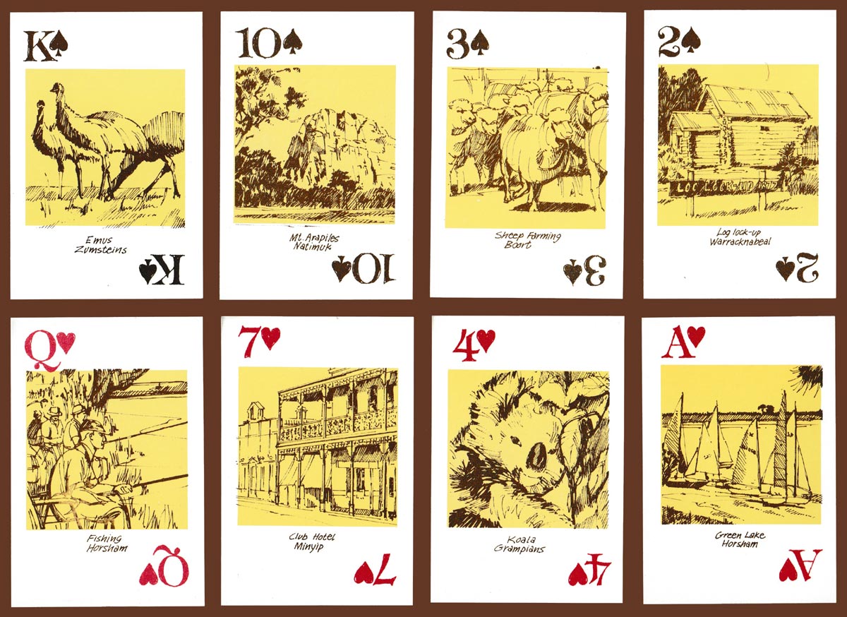Artist and designer Colin Daniels created all the brown and cream illustrations especially for this pack. They depict aspects of the Wimmera region in the state of Victoria, renowned for its flora, fauna, and wilderness areas. Grain (hence the back design) and sheep are the main sources of income. This pack was a project of the Horsham Art Gallery Association, raising finance to house the Mack Jost Collection of Australian art. The cards have square corners and were locally printed (not on proper playing-card board). See the sleeve►