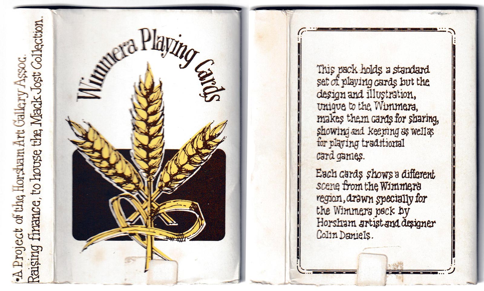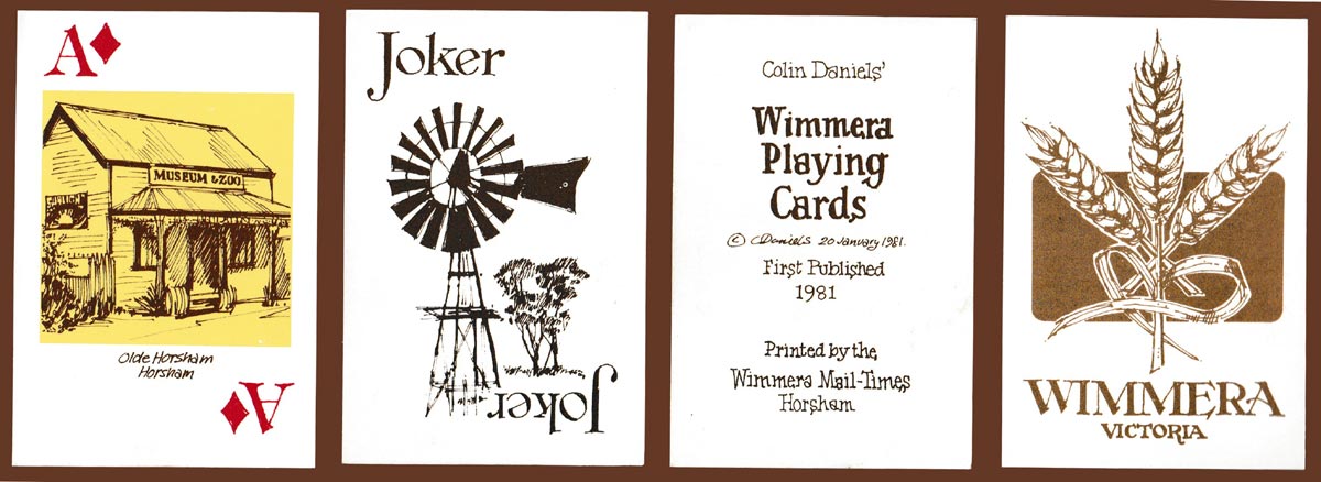 Above: Wimmera Playing Cards drawn by Colin Daniels and printed by the Wimmera Mail-Times, Horsham, Victoria, Australia, 1981. 52 cards + 1 Joker + 1 title card + 1 blank card + small booklet in simple sleeve. Size: 60 x 90 mm.