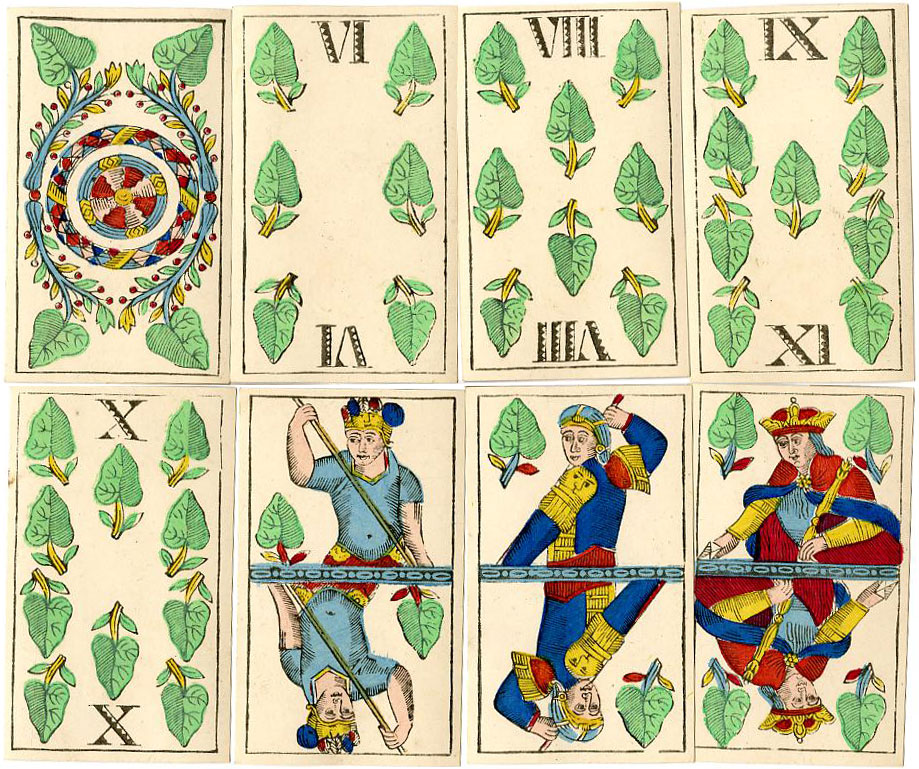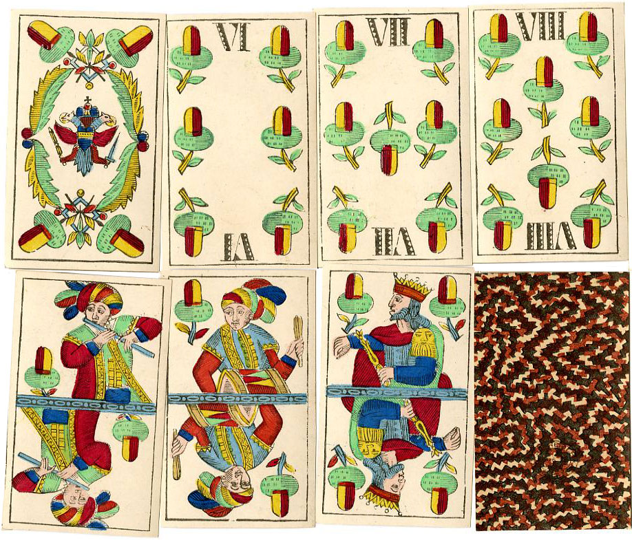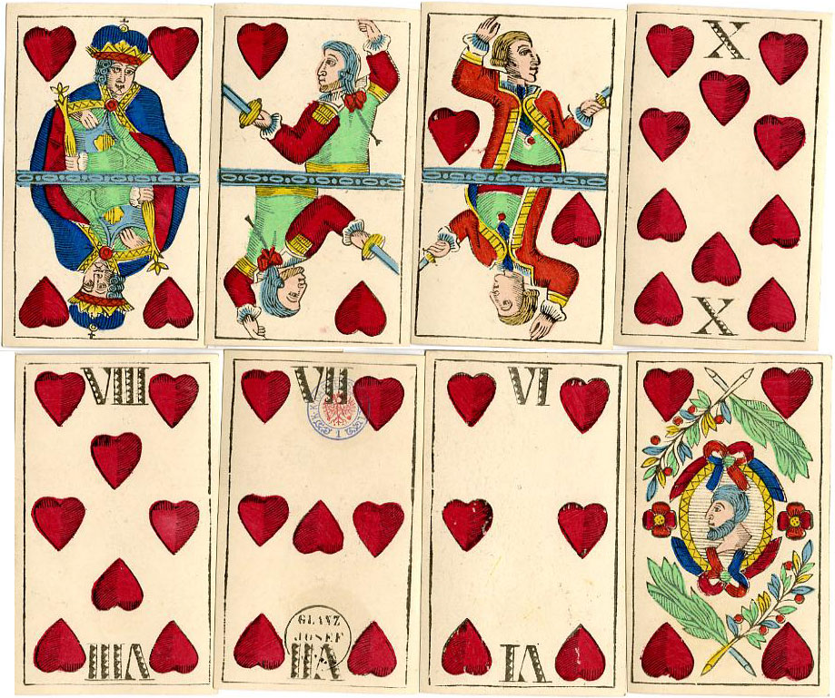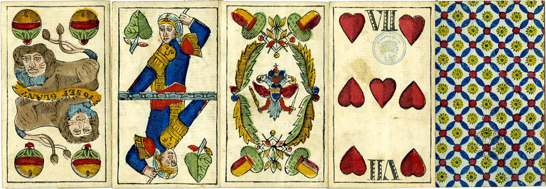Above: double-ended, German-suited, 36-card pack produced by Josef Glanz, printed by J. Wolf. The backs are decorated with a zigzag pattern in red and brown achieved using rollers. The tax stamp on the VII of hearts was in use in Austria from 1877 to 1881. © The Trustees of the British Museum • Number 1896,0501.237►