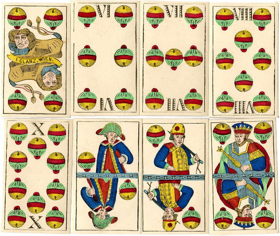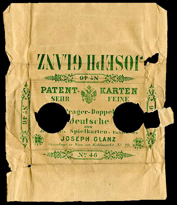 A double-ended, German-suited pack produced by Josef Glanz in Vienna, printed by J. Wolf, in c.1880 is preserved in the British Museum collection. The 2 of bells bears a lion with “J Glanz, Wien” on a scroll. The 2 of acorns bears the Austrian arms. Although the designs are non-standard, some of the court cards are reminiscent of earlier Bavarian patterns, such as the knaves sparring with military weapons, swords or playing musical instruments, wearing varied headgear. It is not easy to say whether the four kings, holding sceptres and each having two suit symbols, are seated or standing. The court cards are devided horizontally with decorative strips. The numeral cards, also double-ended, have Roman numerals but no vignettes. See the wrapper